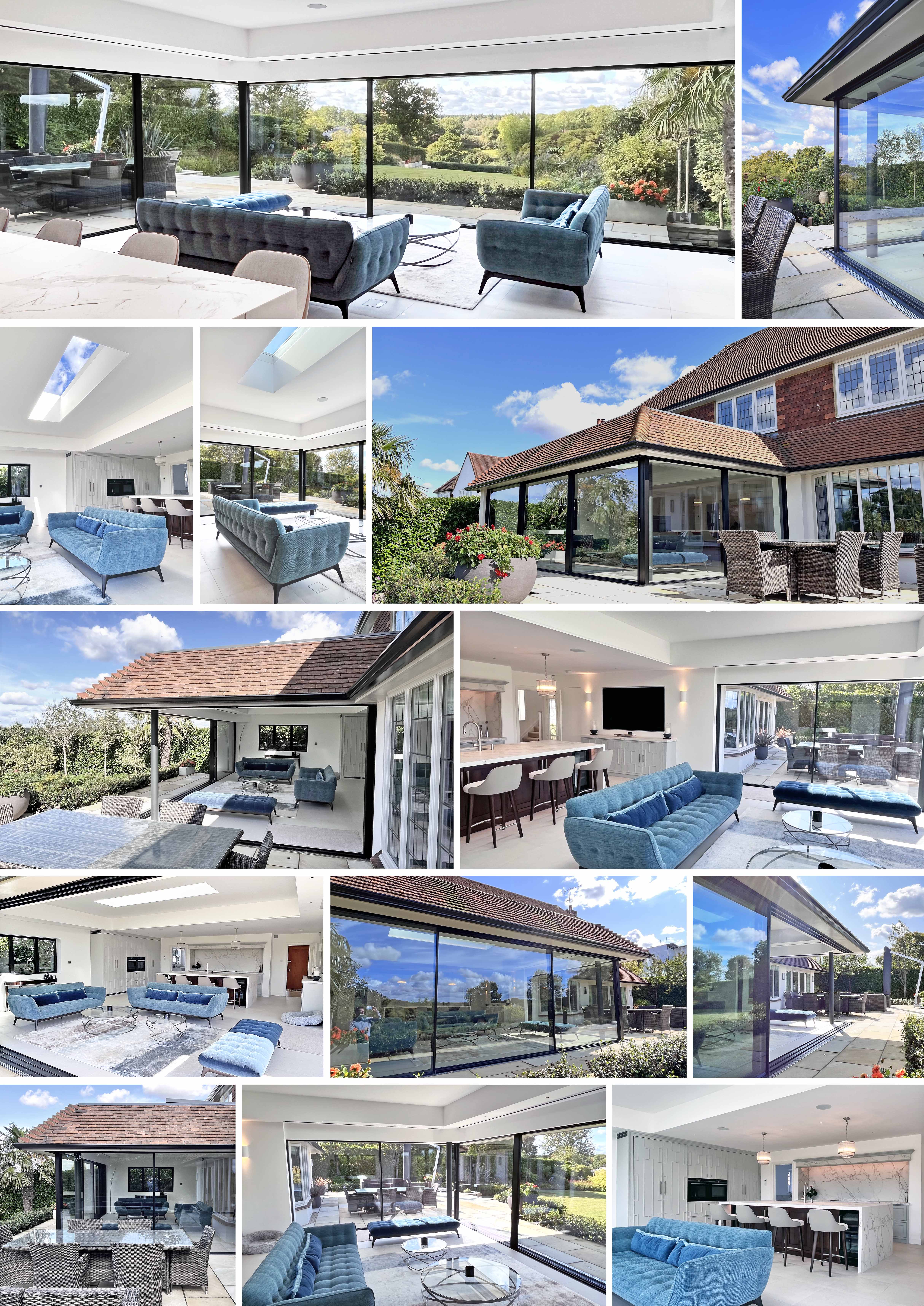 project description I the extension of this detached property located in the green belt has created contemporary enlarged and open plan living, dining and kitchen spaces both internally and externally. the elevated site means that the house benefits from expansive views over the surrey hills and the potential of this sloping site ultimately informed the design of the properties extension, including floor to ceiling sliding glazing on two facades that can fully open up the ground floor to the outside terraced areas and the sloping garden beyond